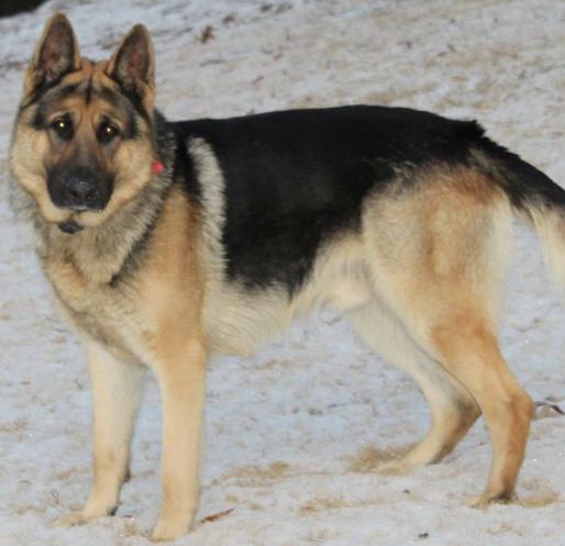 Pet Description:Black, Brown and Cream Male German Shepherd. Warring a red Pet safe collar. 80 lbs. Black marks on each side of inner ears. |