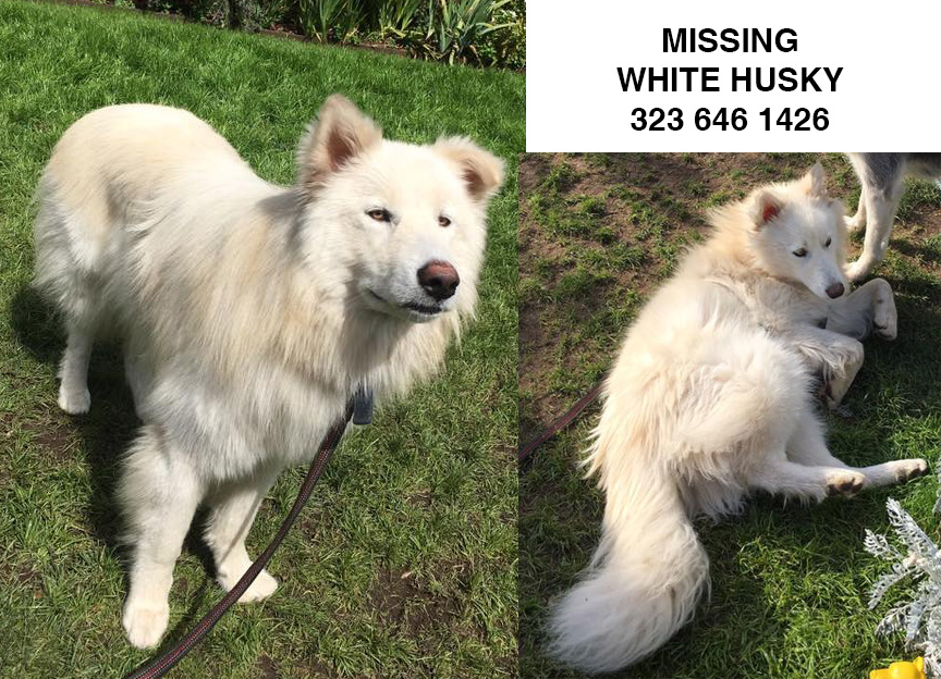 Pet Description:White long haired Husky Mix, male, neutered, 62 lbs Very fluffy - Scared of people, running and hiding.Leash and collar attached |