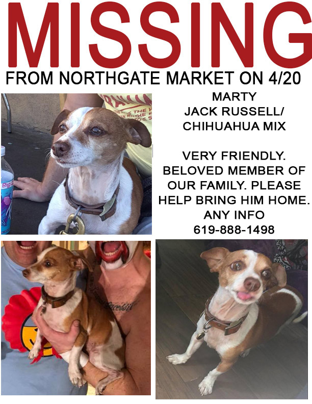 Pet Description:Male neutered red (or brown) and white chihuahua/ jack russell mix. Answers to Marty. Beloved family member, please help bring him home. |