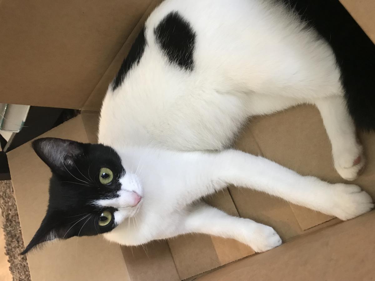Pet Description:Mostly white cat with some black spots. Black covering most of face like a mask. |
