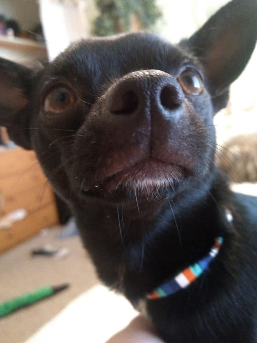 Pet Description:10 month, 8 lb Chihuahua. Black with white chest. No tags (they are in the mail :( ) no chip. Striped collar. Not neutered. |