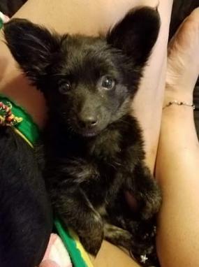 Pet Description:Small black Pomeranian & chiuaua mix long hair skinny wearing a black collar with gray paw prints. |