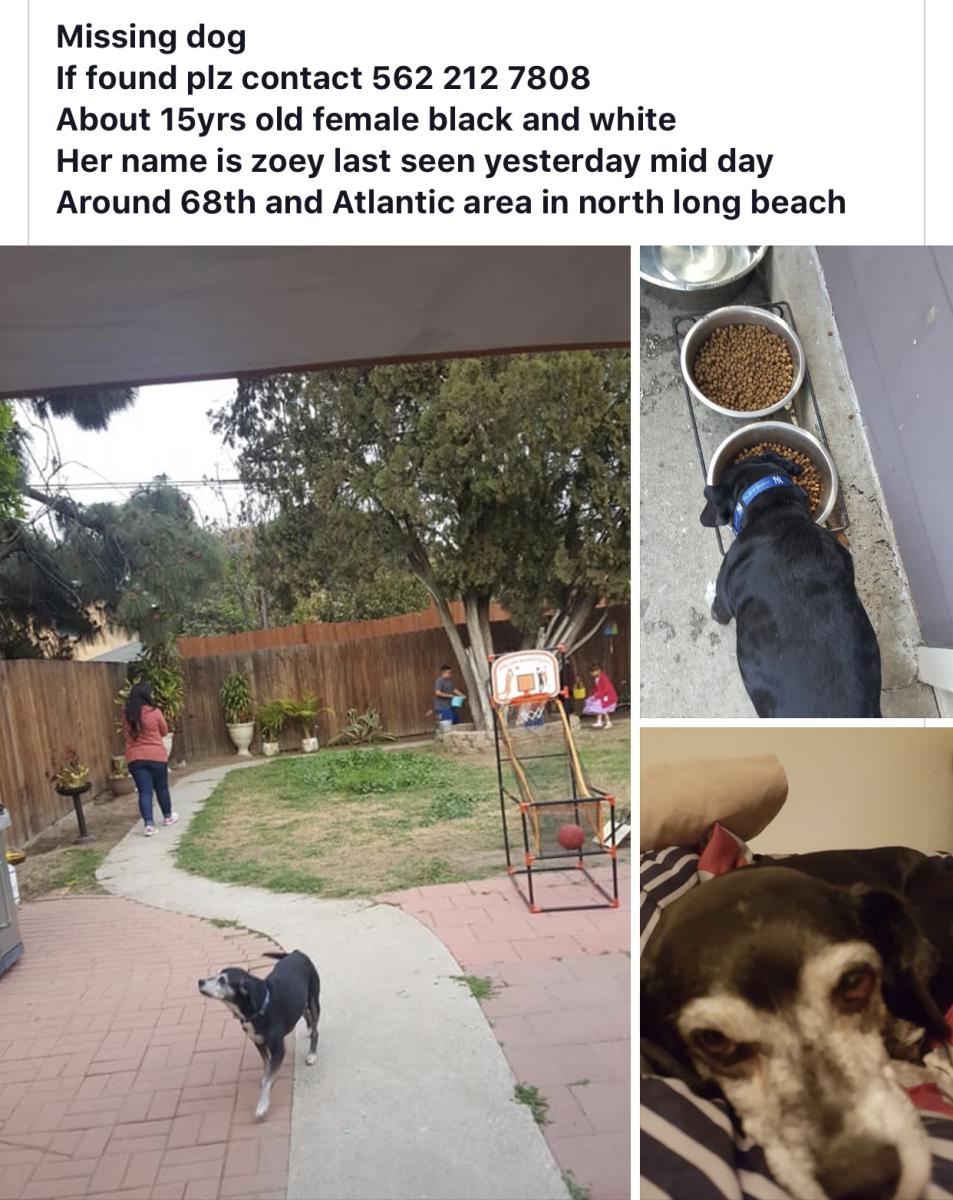 Pet Description:Zoey is a Cocker Spaniel and Doberman mixed dog. She is medium to small in size and has black fur with white and grey snout and paws. She is wearing a new york yankees collar. |