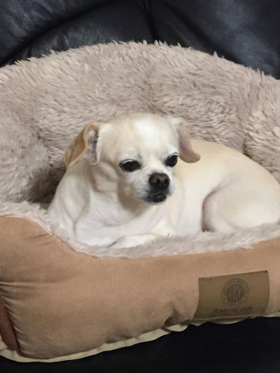 Pet Description:She's a Chihuahua/Pekingese mix. Her ears are tan/brown and her neck is white and onwards down her back is tan/brown. Her paws are white and as well as her hind legs. Her tail is tan/brown until the tip which is white. She has no front teeth and only a couple of back teeth and her tongue sticks out at times. |