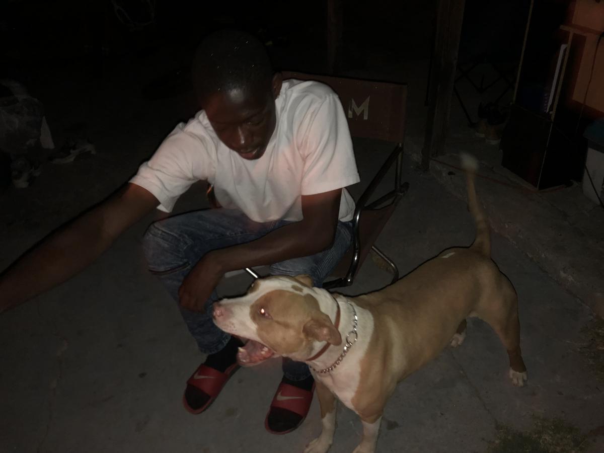Pet Description:fawn and white pitbull he has a brown spot on his head surrounded by white and a white spot on his back surrounded by brown lits a fawn brown his eyes matches his colt |