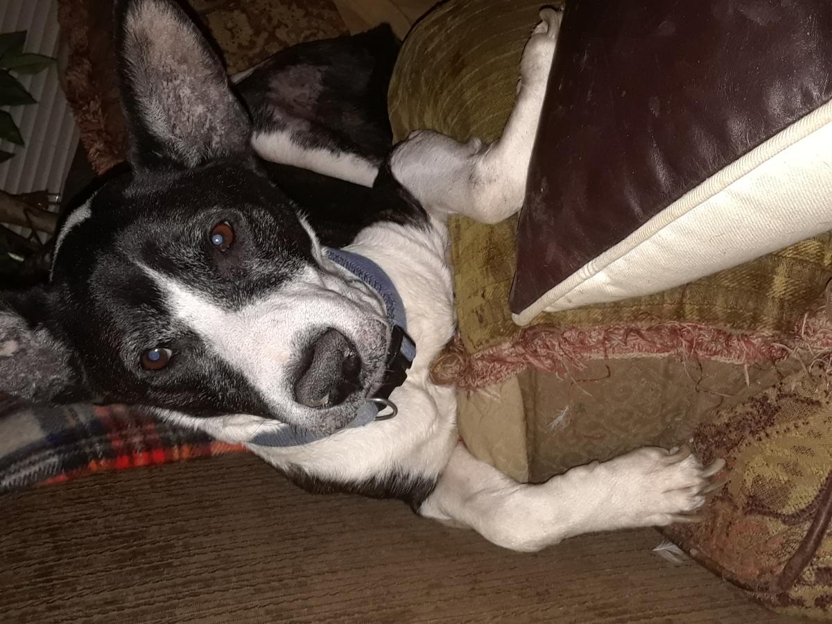 Pet Description:Black and white collie /pitbull bald spot on butt and leggs name maggie, blue collar she loves people |