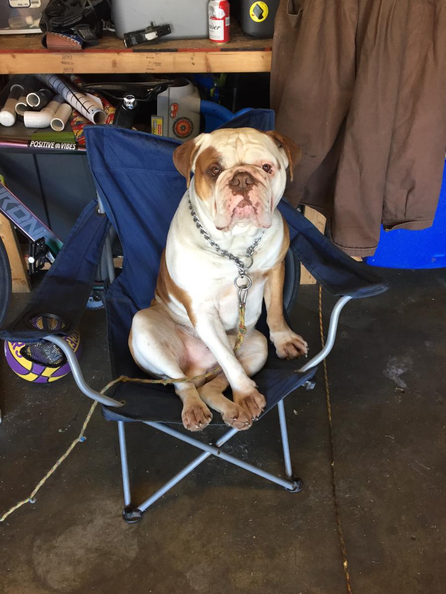 Pet Description:Brown and white English bulldog. With brown patch over right eye. |