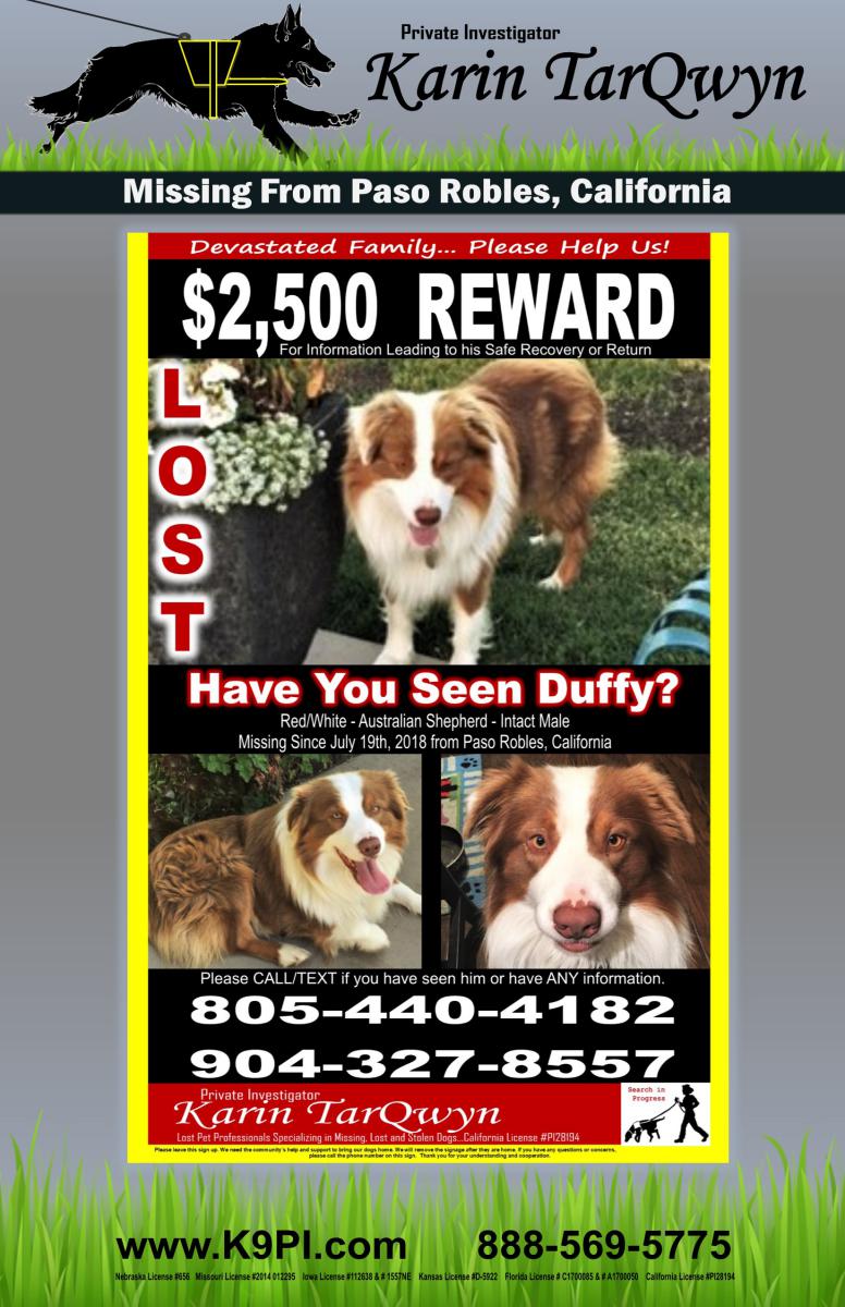 Pet Description:Duffy went missing on July 19th. He went out in the morning and was never seen again. His family is desperate to get him back |