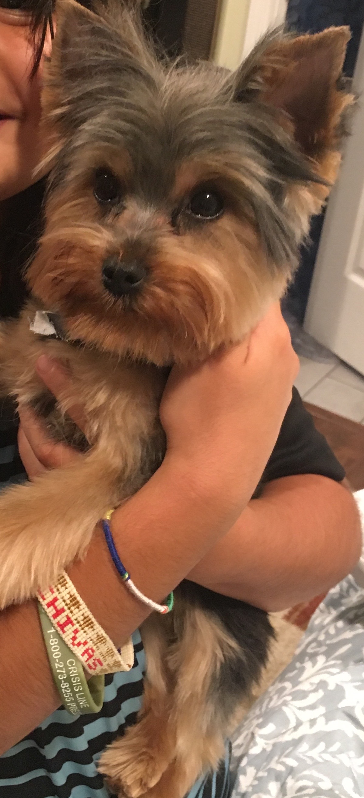 Pet Description:Small, black and brown colored Yorkshire terrier puppy. Weight: 3.2 pounds. Was wearing a brown collar with two plaques: a red paw shaped and blue bone shaped. |
