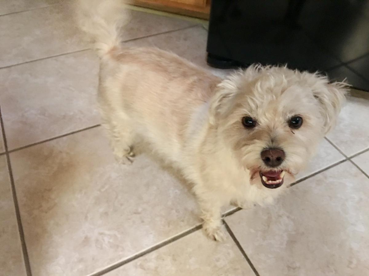 Pet Description:No collar, no chip, small, overweight, white with golden streak on back. |
