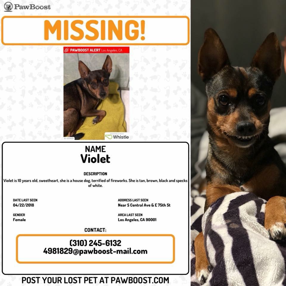 Pet Description:Violet is a dark brown light brown 10y/o Mini Pinscher. White tippy toes and white chest. Small overbite. |