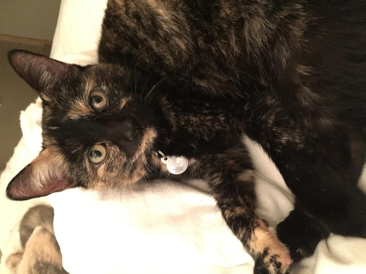 Pet Description:Adult female tortoise shell. Wearing burgundy collar with name tag. Microchipped. |