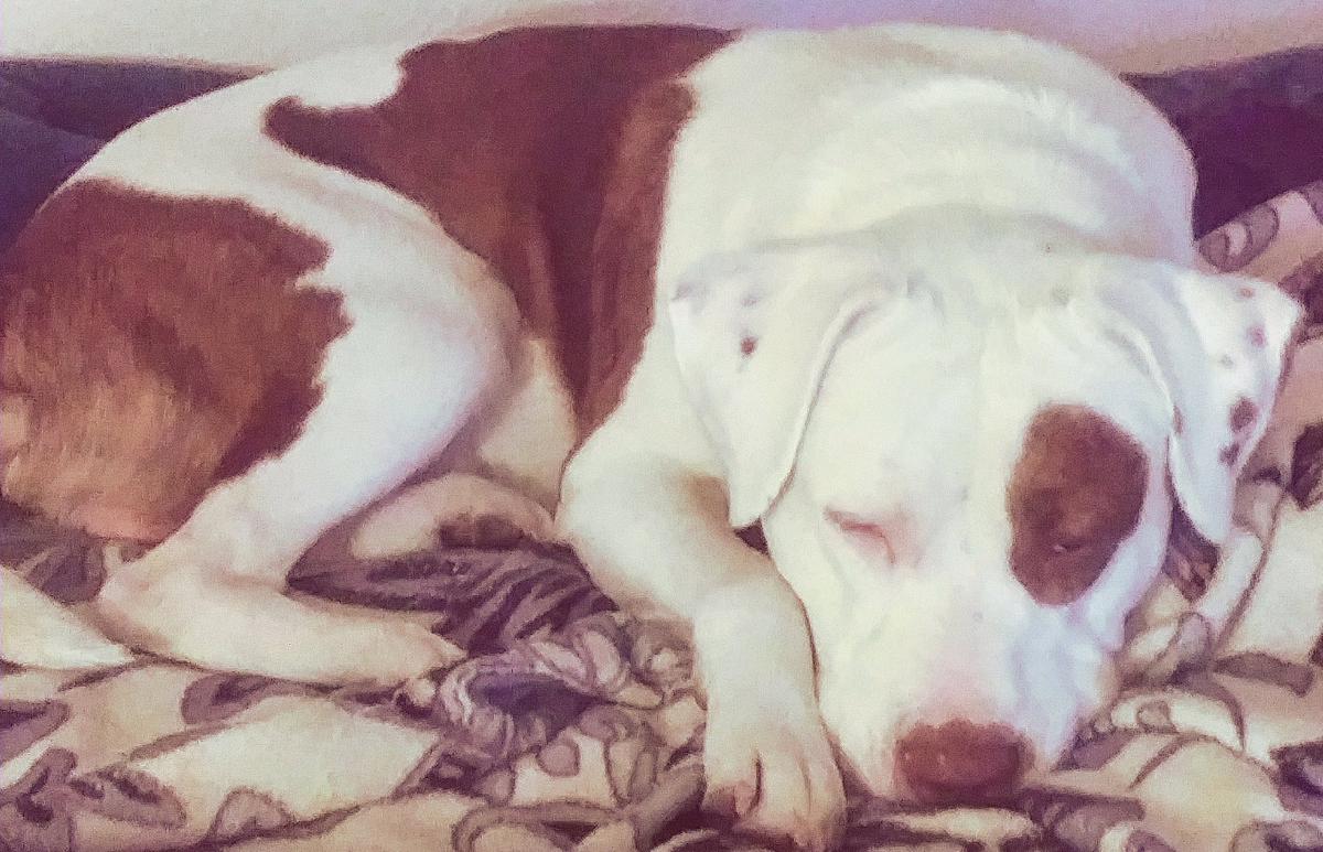 Pet Description:Pitt/lab mixed white with red brindle spots one spot over left eye |