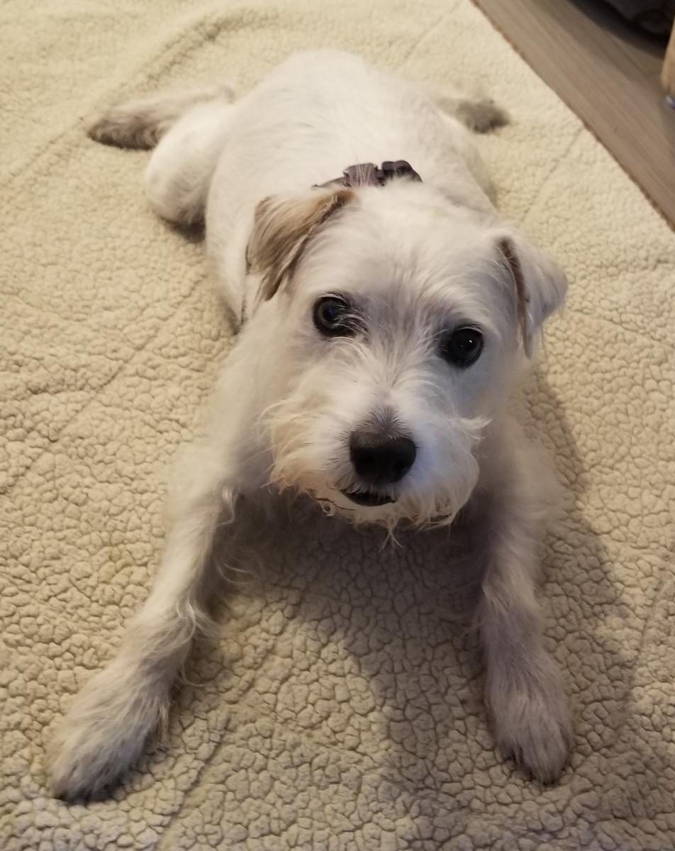 Pet Description:The dog has short white hair with one light brown ear and some dark skin markings. He is well-fed, house-trained and very well behaved. |
