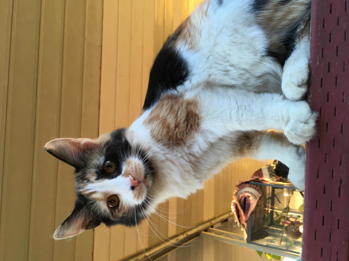 Pet Description:Calico kitten around 5 months Very sweet and dócil friendly with kids, adults, cats , dogs has a little beauty mark on her nose, fluffy mostly grey tail her fur colors orange black, white |