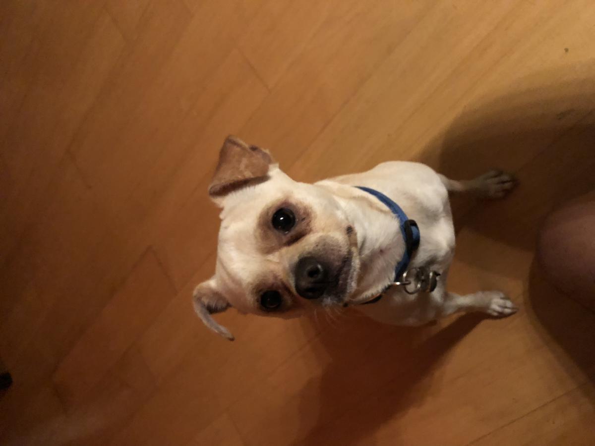 Pet Description:Small Tan-Cream dog wearing a blue collar with a bell on it |