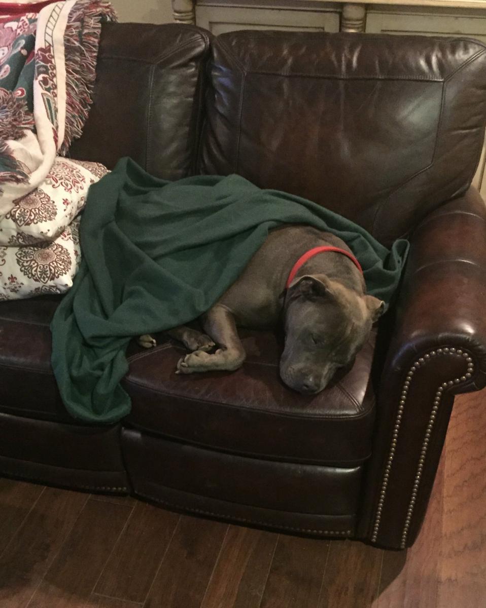Pet Description:Blue Pit Terrier, certified comfort dog and trained with microchip. Was wearing a green color. He is very emotionally intelligent, sweet, and scared of water. It is likely he came up to someone’s house or car looking for shelter during storm after he escaped from our home. |