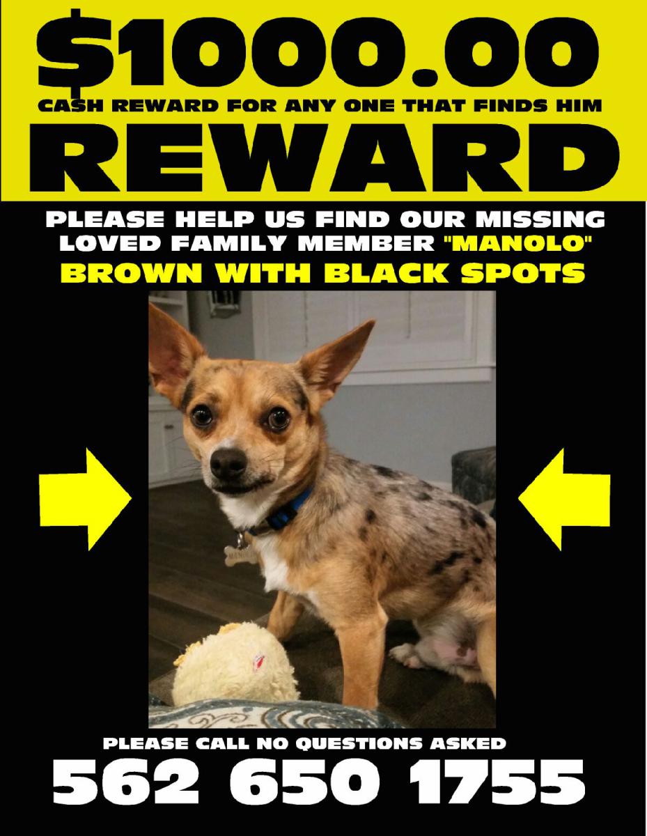 Pet Description:Manolo is a male dog he is dappled primary color is brown then black and grey he has a white chest he’s very sweet he will bark and look mean but if you say who’s a good boy he immediately changes his behavior we really miss him and want him home there is a 1,000 reward for anyone joe finds him no questions asked |
