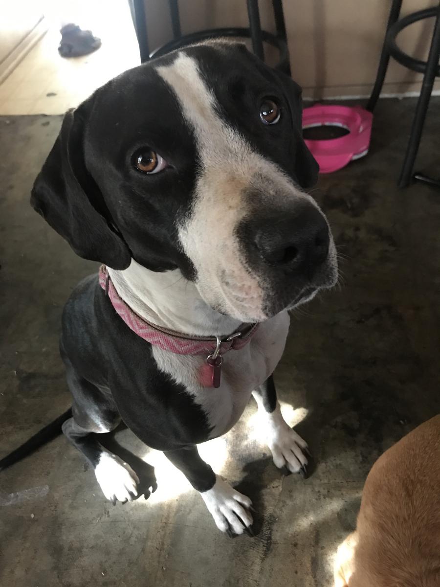Pet Description:Black with a white chest, is wearing a pink collar without name tags. Friendly. |