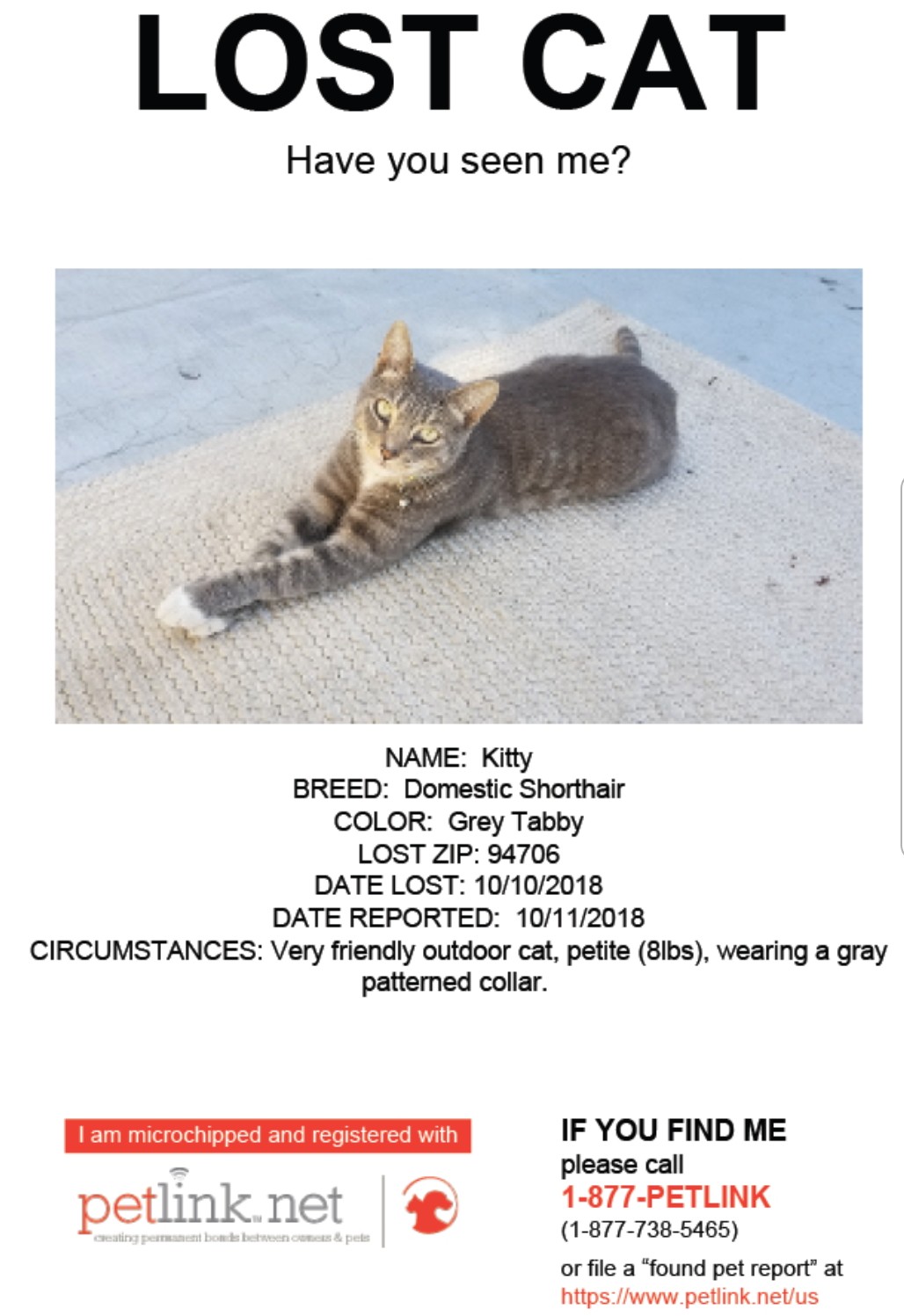 Pet Description:Gray tabby, white paws and belly. Last seen wearing a gray collar with colorful geometric shapes. She is micro chipped. Super friendly and sweet. |