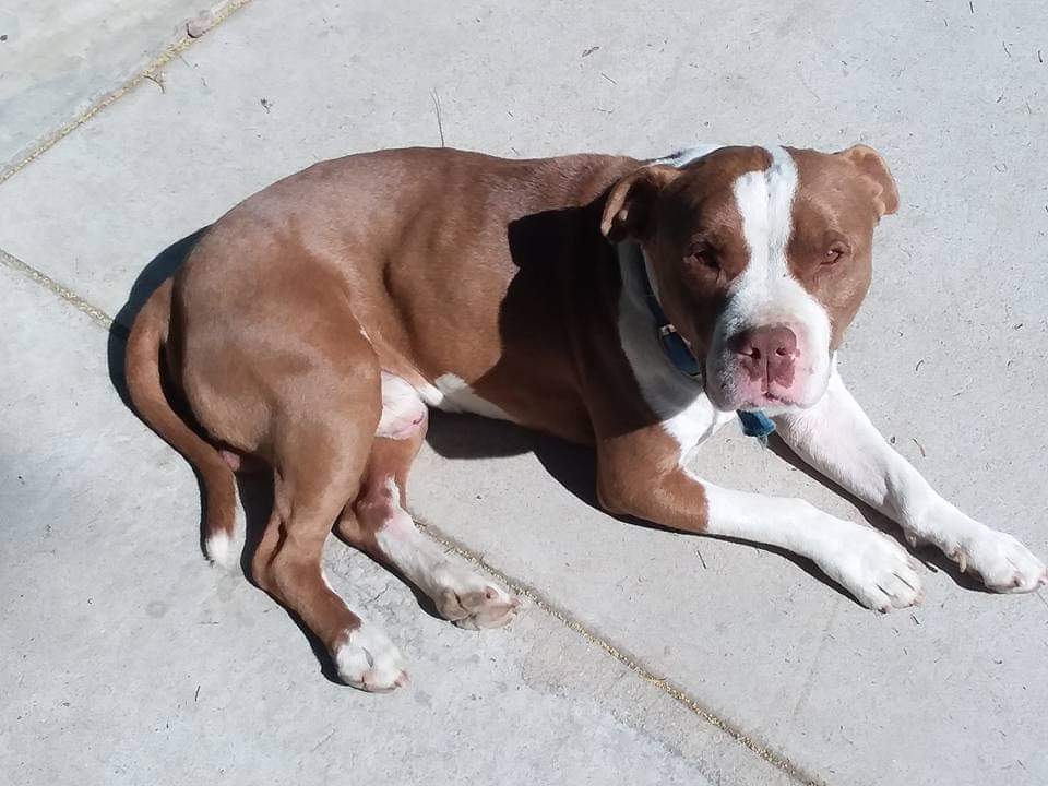 Pet Description:He is brown and white, has a scar on his left back inner leg from a previous injury. Very tip of his tail is white. He has brown eyes. He was wearing a blue color with license. |