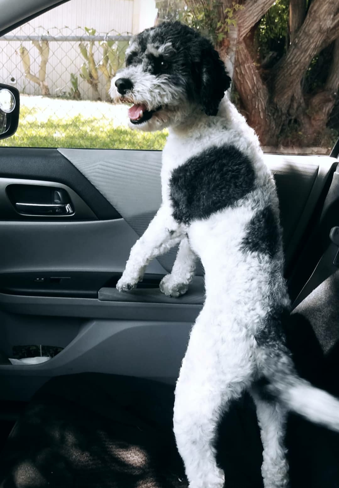 Pet Description:White poodle with black spots w/black ears. 4 years old. Last seen with a black collar with dog paw name tag. |