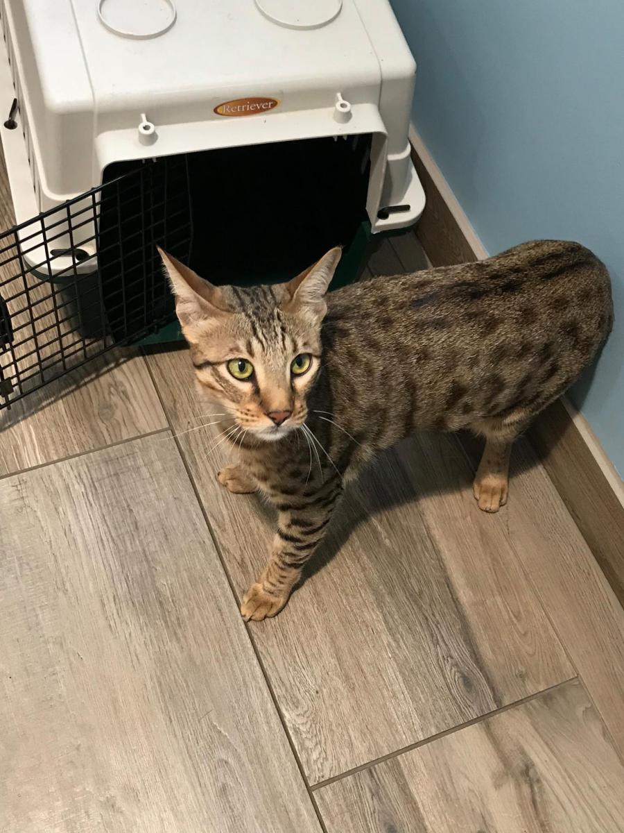 Pet Description:Golden Brown altered male, Savannah/Tabby aprox 14 lbs. Long neck and body compared to most cats. He has bold black spots along his back and stripes along his lower sides. His chin is cream/white and he has green eyes. No collar but does have a microchip |
