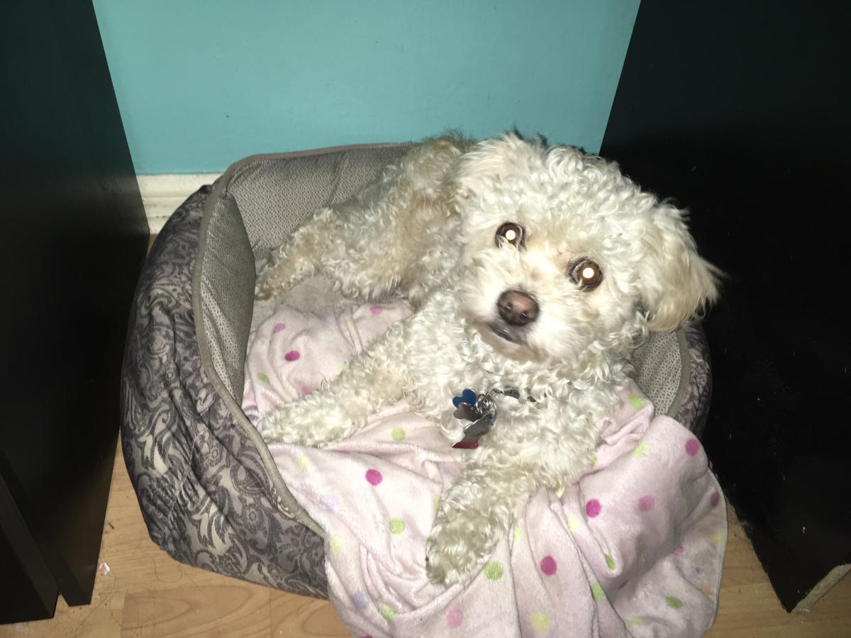Pet Description:She has a pink collar with two name tags her name is Lola and mommy name Karina also she is cream color and has short hair. |