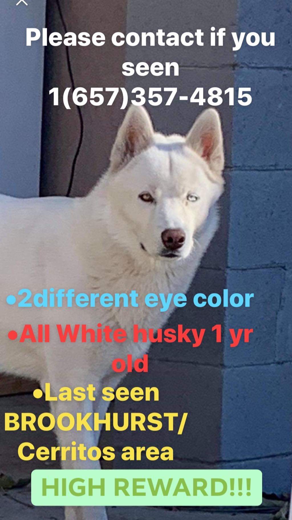 Pet Description:All white husky, one brown n one light blue eyes714-452-4132High Reward Guaranteed |