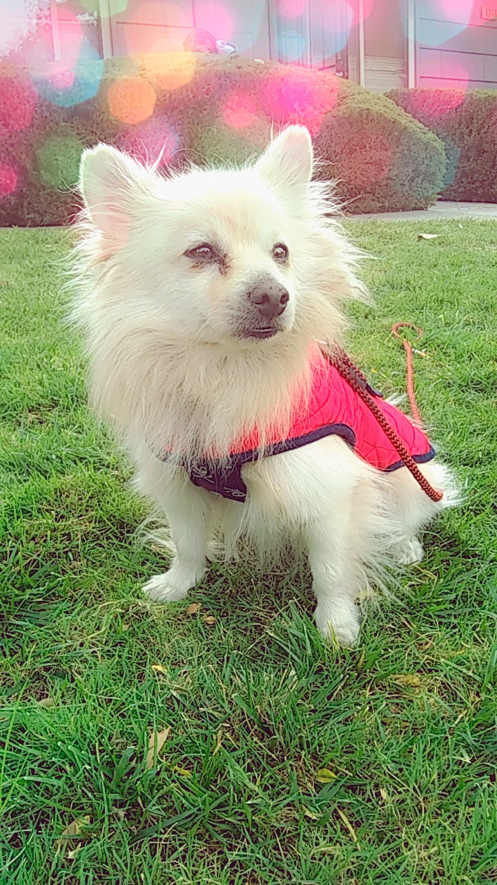 Pet Description:Pomeranian and American Eskimo long blonde fur. Wearing a red and blue collar no name tag. Not fixed. Bad teeth. |