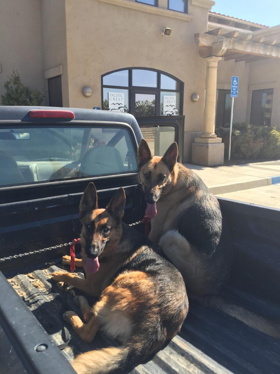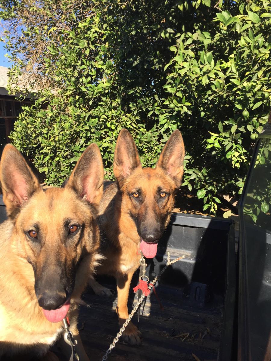 Pet Description:2 large female German Shepherd dogs - sisters and 5 years old-one has a large black spot on her tongue. Black & tan with just a little white, especially under their stomachs and legs. One is larger & weighs more. |