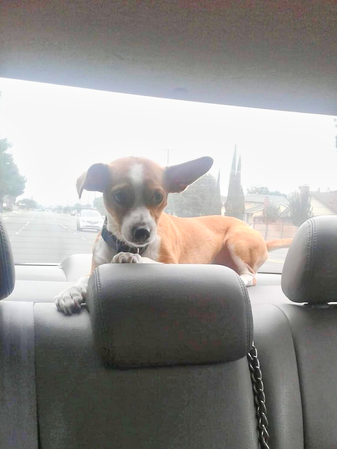 Pet Description:Brown and white small chihuahua mix, very friendly and wearing a black harness. |