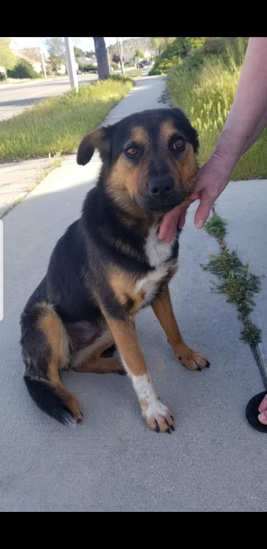 Pet Description:Black & brown, @ 40 lbs, white on chest & right front paw |
