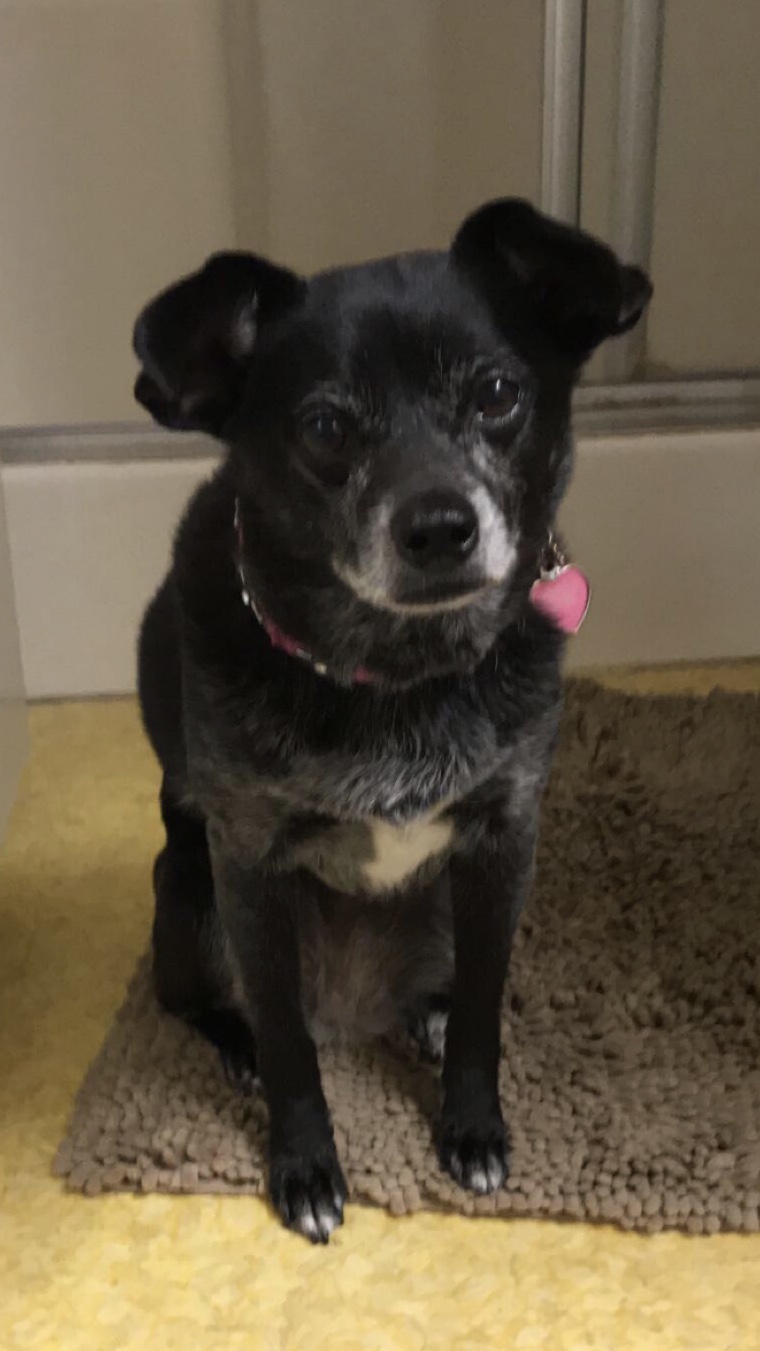 Pet Description:Black Chihuahua mix with white and the gray around her face,stomach and paws. Wearing a pink color with a pink heart shaped tag. |