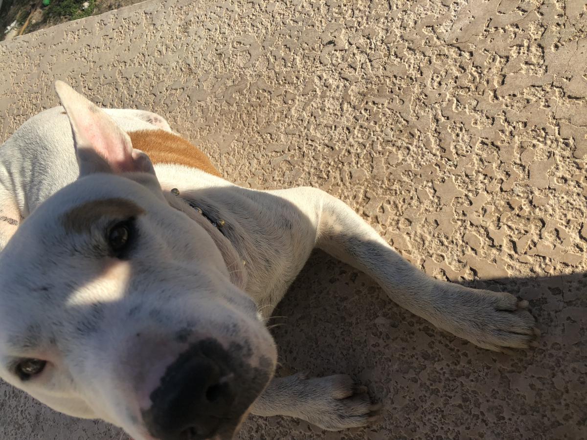 Pet Description:Cesar, male. White dog with brown spots. Ears stay pointed up. Calm dog. |