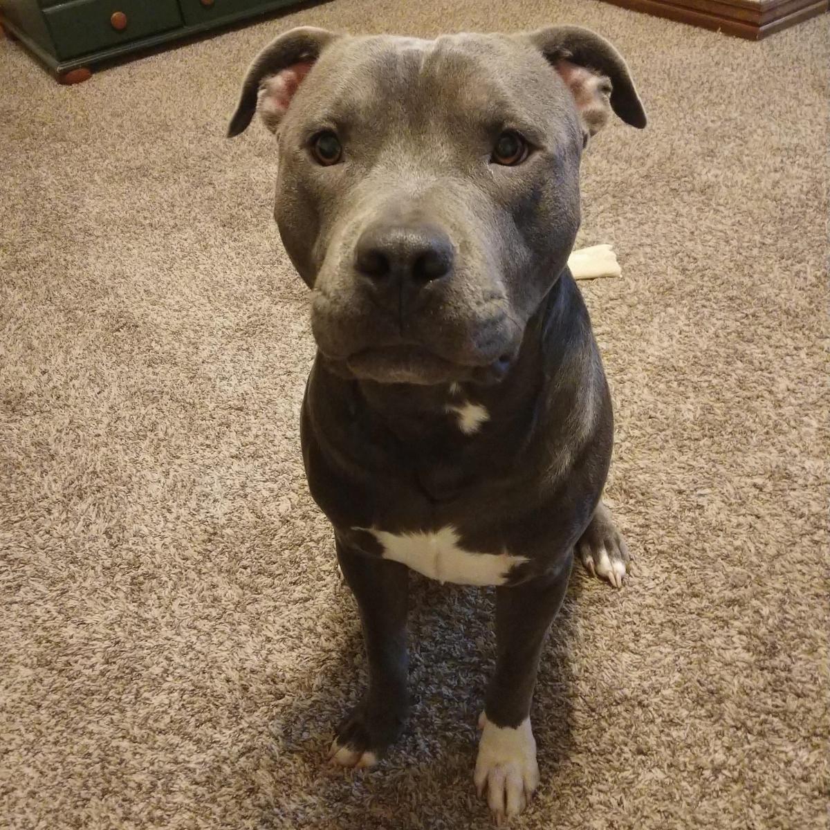 Pet Description:Young dog, very puppy personality. Short, dark coat grey in color with a white patch on his chest and one noticeable sock on his front left foot, with white toes on his front right. |