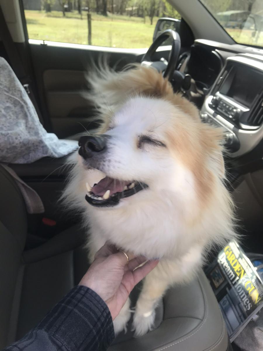 Pet Description:Tan and white, no tags, small collie breed, 30 lbs approx Has blue harness on |