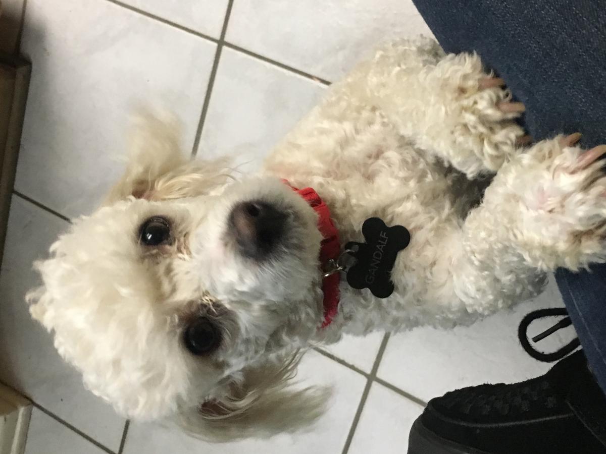 Pet Description:He is a white, toy poodle. Recently groomed with docked tail. He goes by Gandalf or Gandy. He has red, watery eyes from seasonal allergies. |