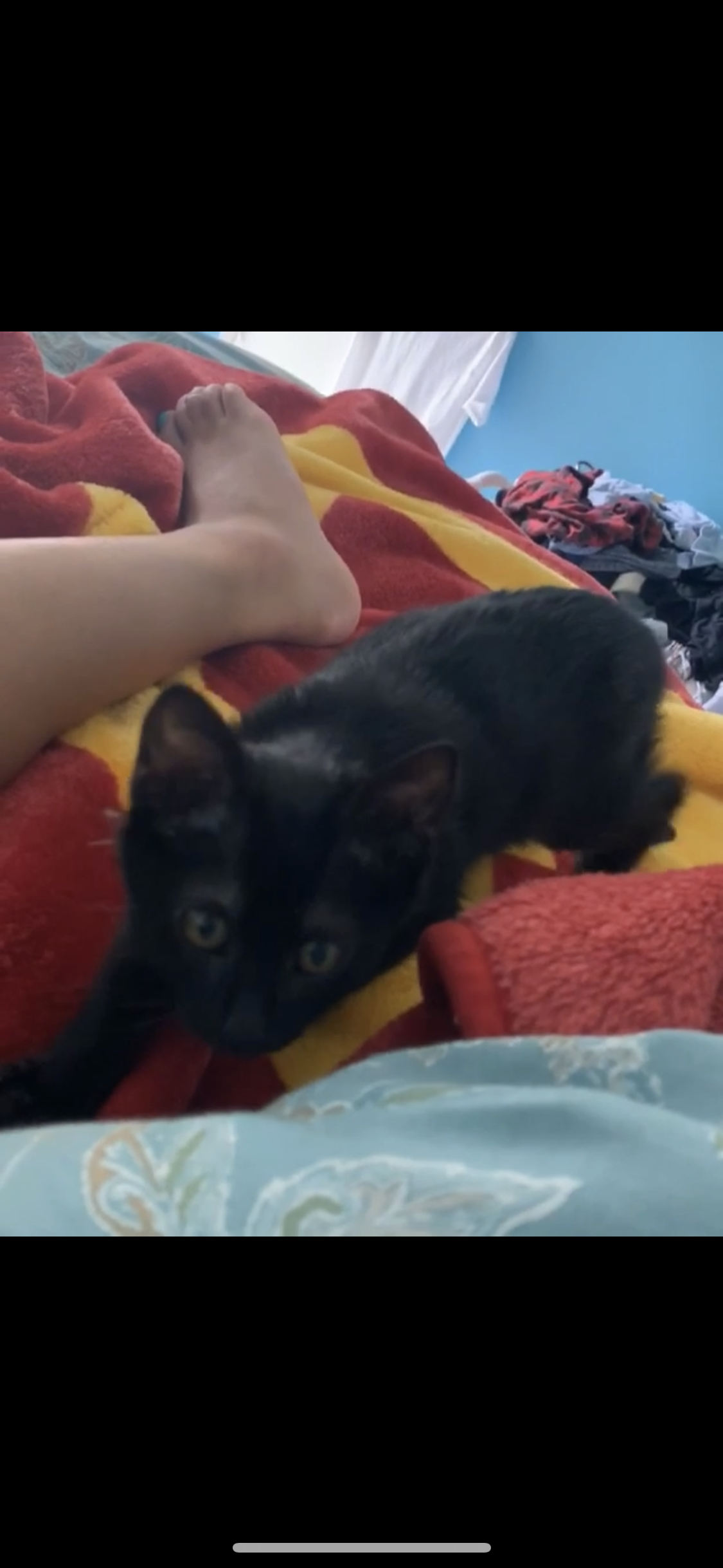 Pet Description:Little black kitten. She has a scar on her tummy. |