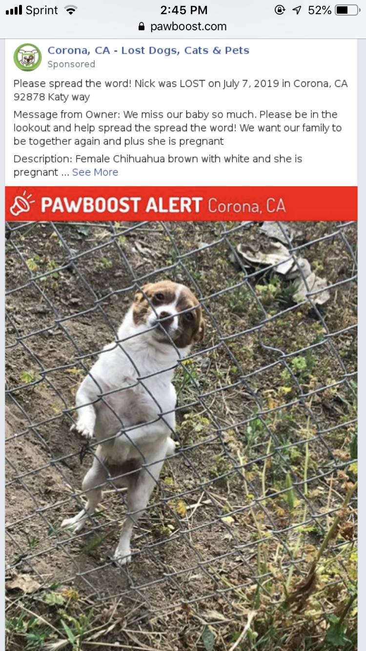 Pet Description:Female dog chihuahua she is brown and white and she is pregnant |