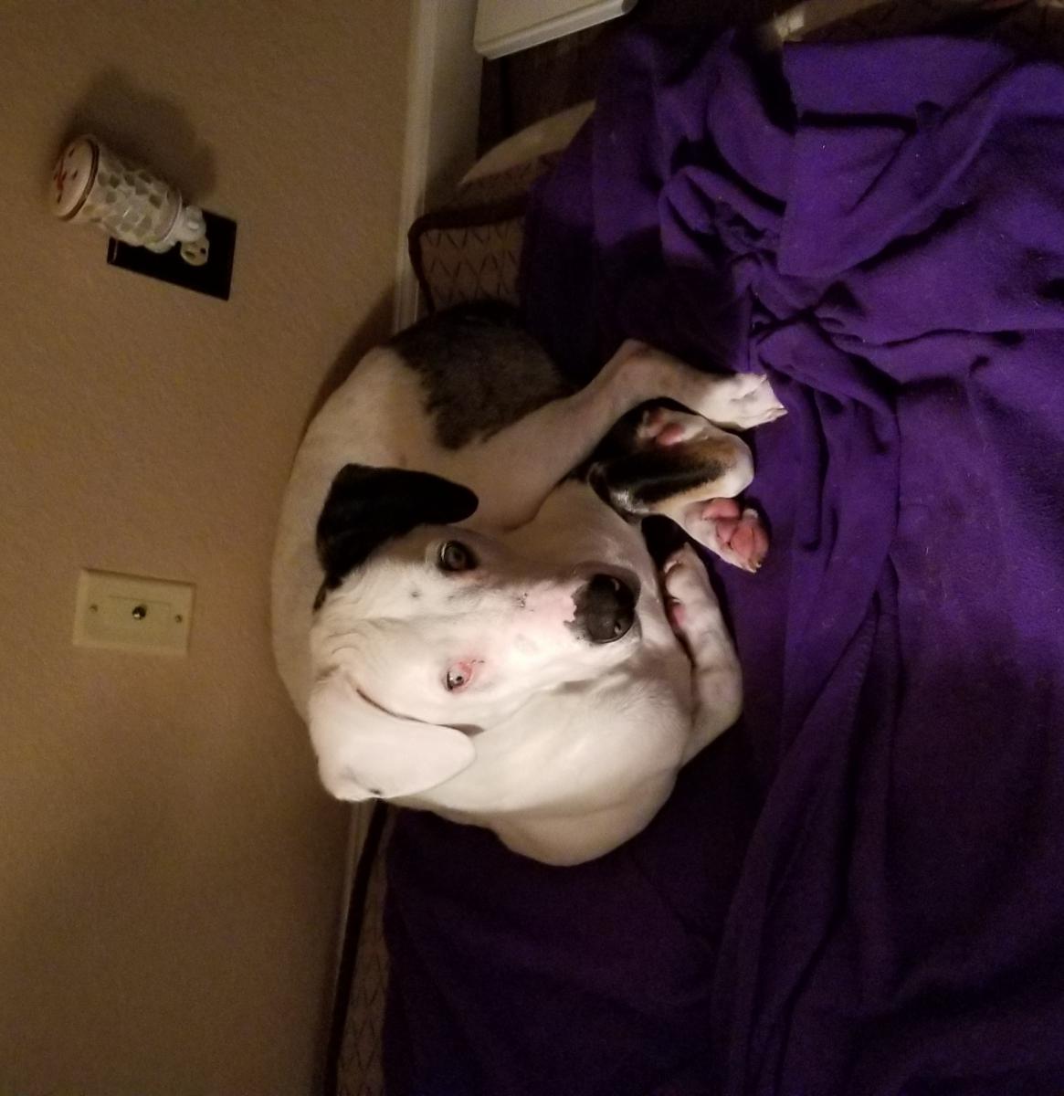 Pet Description:White male, neutered dog with one black ear and one white ear. He has blue eyes. Pupils are not normal. He has black and grey leopard spots on hind end. |