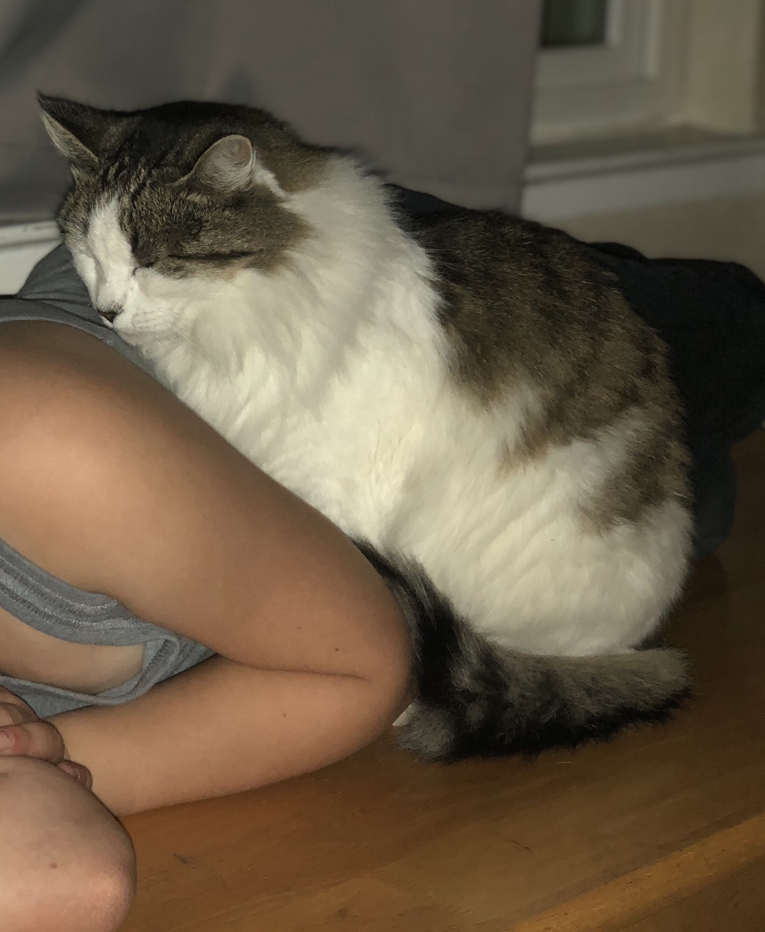 Pet Description:Gypsy is mostly white on her face, legs and tummy. She has grey and brown stripes on her face back and tail. She has a small white spot in her back. Long hair, Very friendly. |