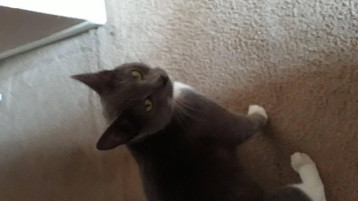 Pet Description:Mostly grey with white chest and paws. Blue reflective collar with tags |