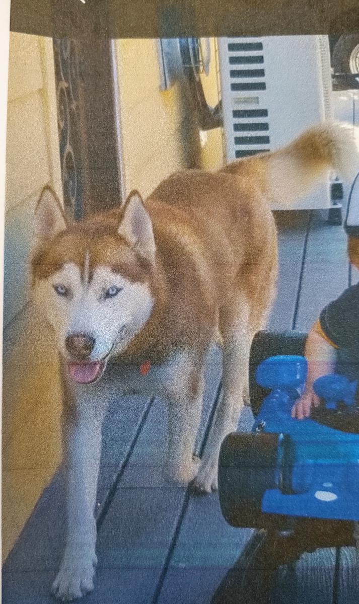 Pet Description:Red and white male unaltered husky with light blue almost white eyes. Very friendly and our family. |