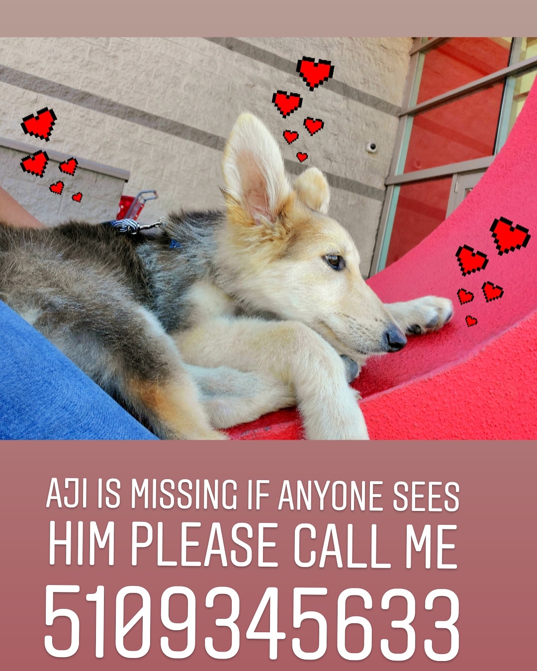 Pet Description:He is a puppy and he has a blue harness on and he has a slight bump on his right cheek from play fighting with his previous owners dog and he is shy and when he walks its kind of sideways and he is always looking around or cries when he is alone |