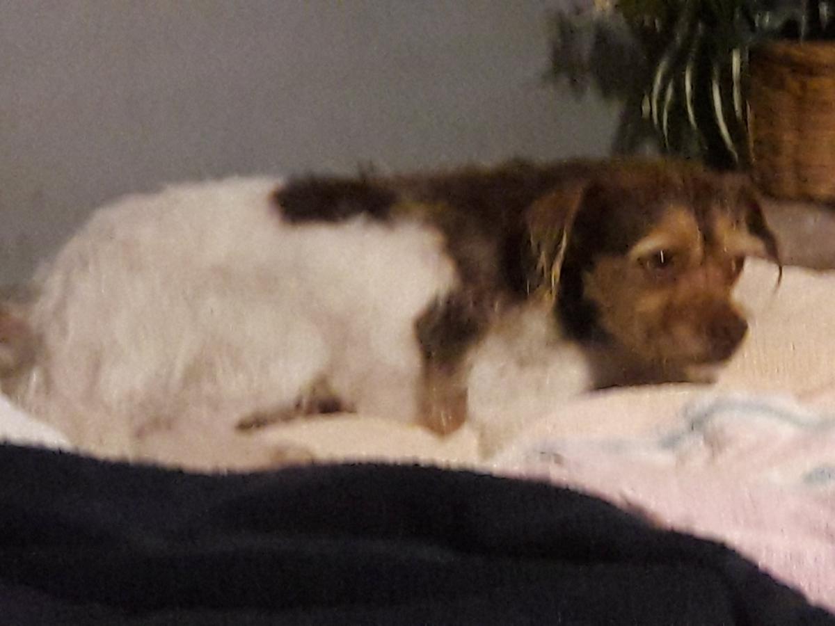 Pet Description:Medium size terrier mix.Wired hair white hair on body with a brown face. |
