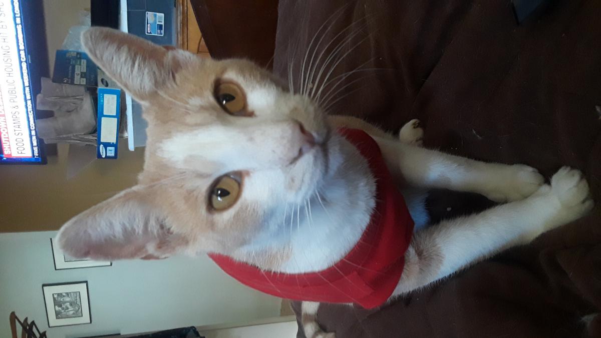 Pet Description:3 year old adult male neutered tan and white tuxedo cat. He is friendly but skittish around strangers. |