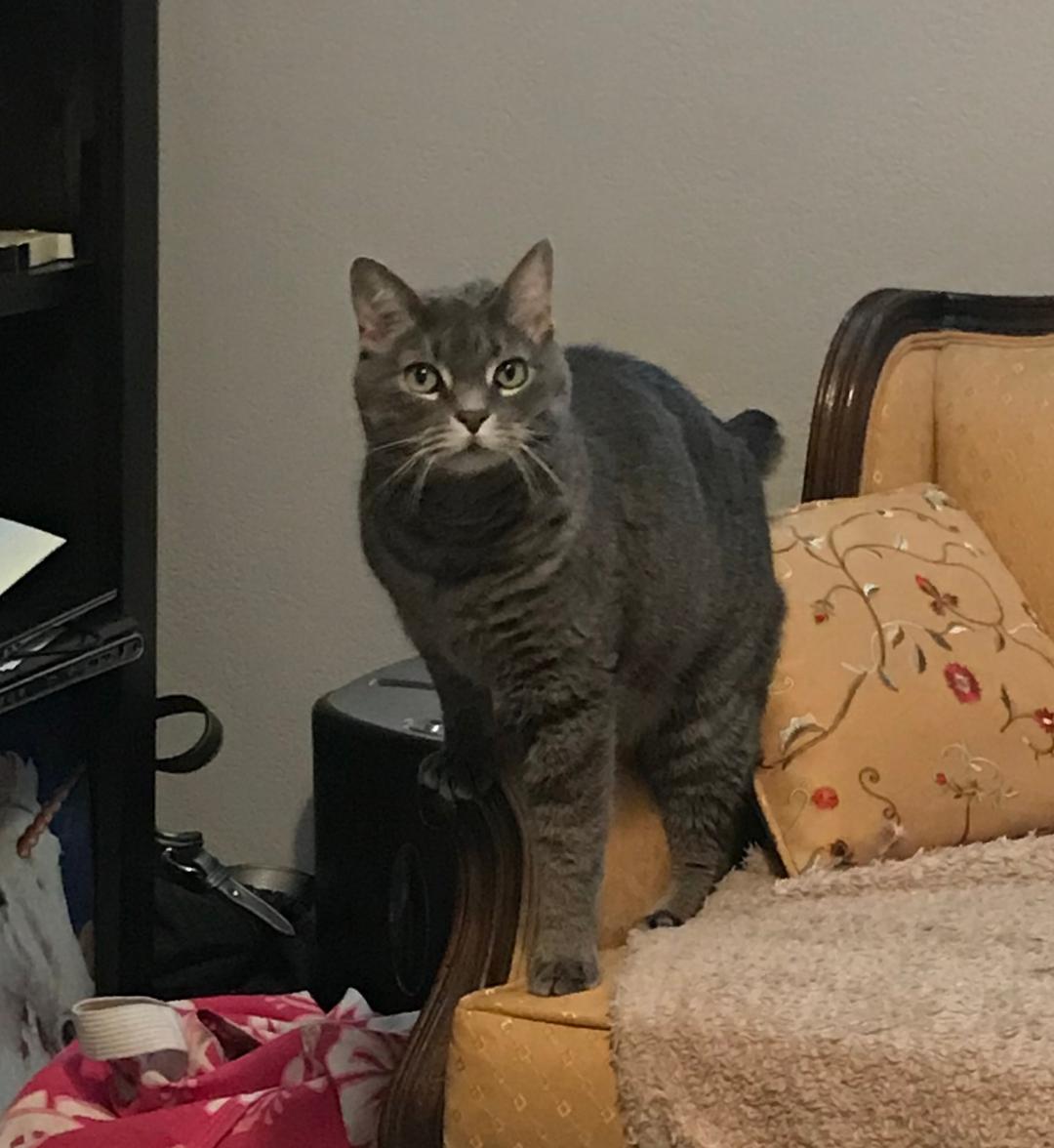 Pet Description:Has a one inch tail. Is mostly grey with some lighter grey stripes. Weighs 10 pounds and is 7 years old. Little sometimes coughs due to asthma. He is afraid of people and is skittish. |
