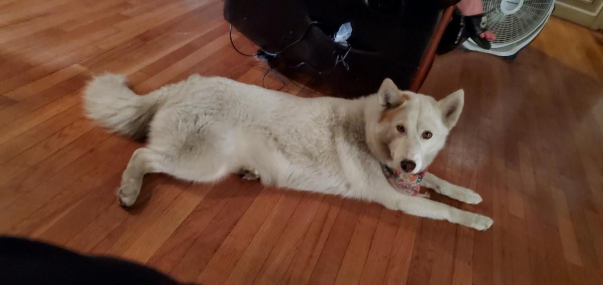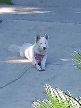 Pet Description:Almost all white husky super friendly people die little Brown colouration on here but mostly white |