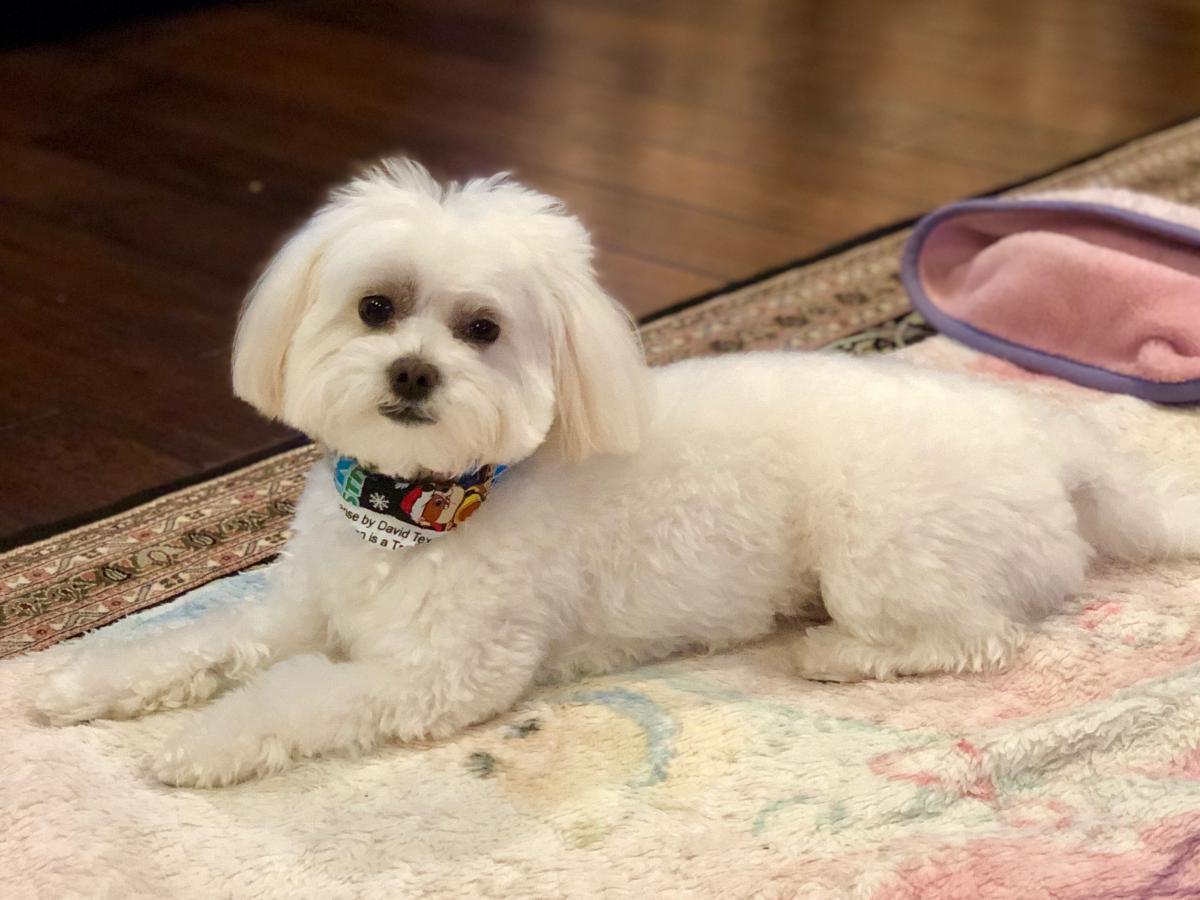 Pet Description:Small fluffy and white, wearing a red sweater. |